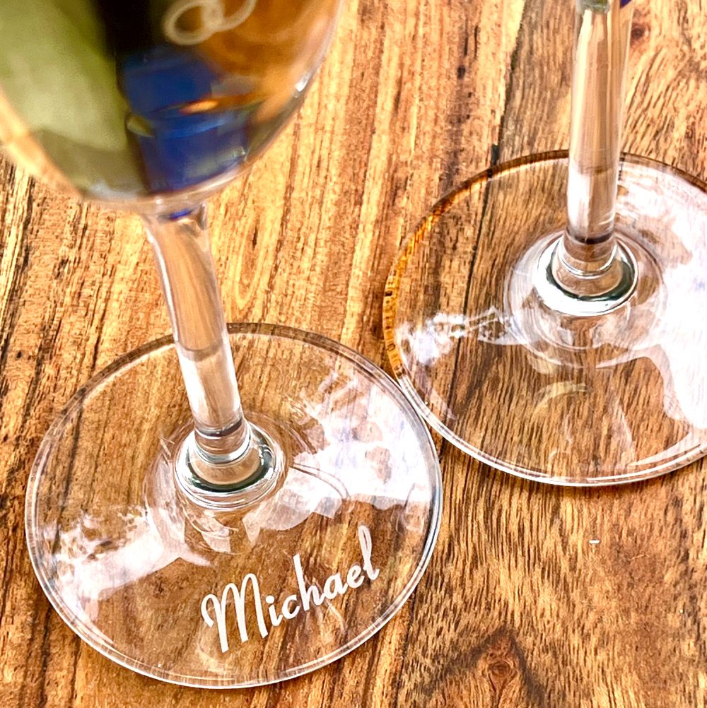 Dæk et unikt bryllupsbord og forbløf jeres gæster med champagneglas graverede med jeres monogram, navne, bryllupsdato samt gæstens navn på glasses fod.